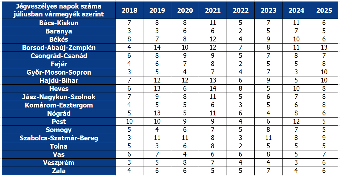 Jégveszélyes napok számát illetően júliusban 4 olyan nap volt, ami legalább 13 és 1 olyan nap, ami 17 vármegyét érintett.