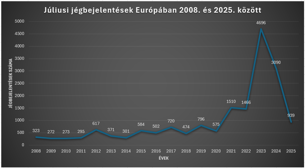 A hónap nem csak Magyarországon, hanem Európa más részein is extrém időjárási eseményeket hozott. A kontinens több régióját ismét aszály sújtotta, amit a tartós hőhullámok és átlag alatti csapadék eredményezett. Az ESWD adatbázis alapján az elmúlt 17 év időtávlatában 2025 júliusában történt az ötödik legtöbb jégbejelentés. A tartós hőhullám, így az aszály következtében sokkal kevesebb jégveszélyes zivatar tudott kialakulni júliusban az elmúlt évekhez képest.